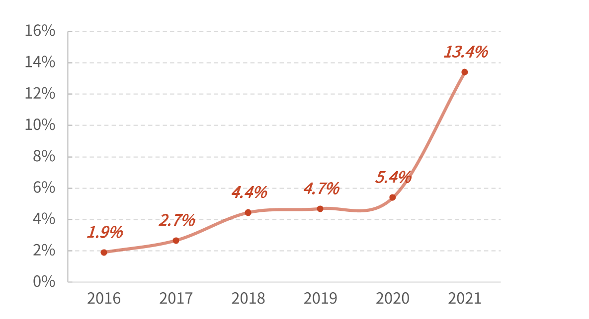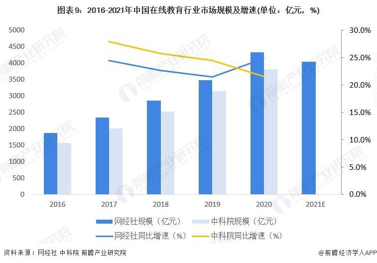 2016-2021年中国在线教育行业市场规模及增速(单位:亿元,%)