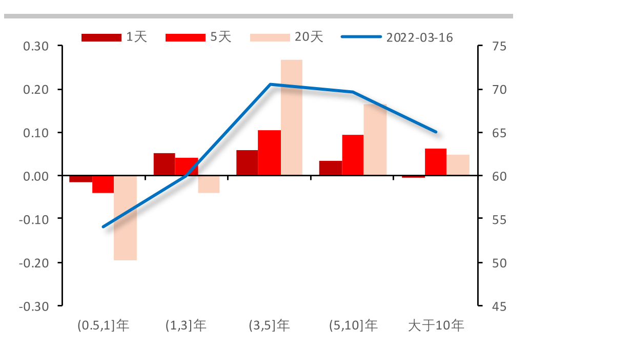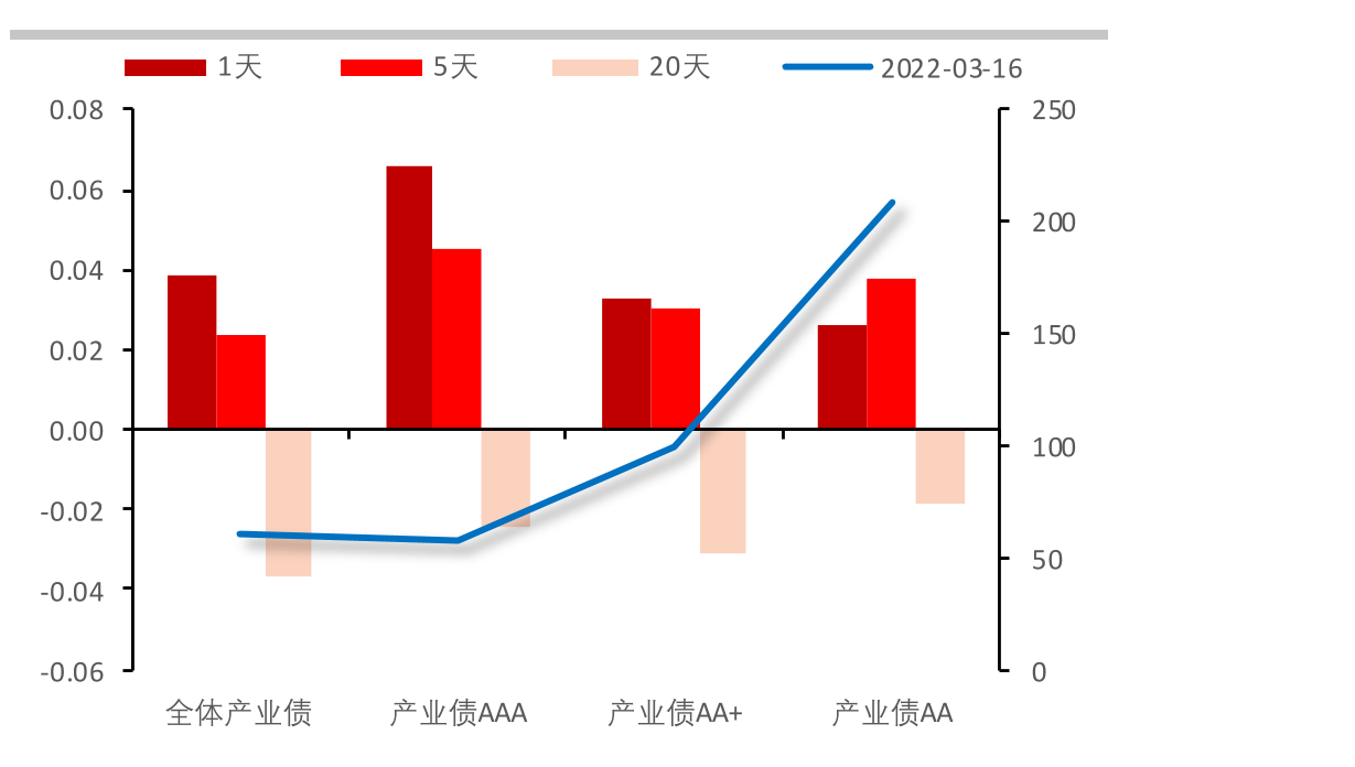 不同期限产业信用利差(BP,右轴)及变动(%)