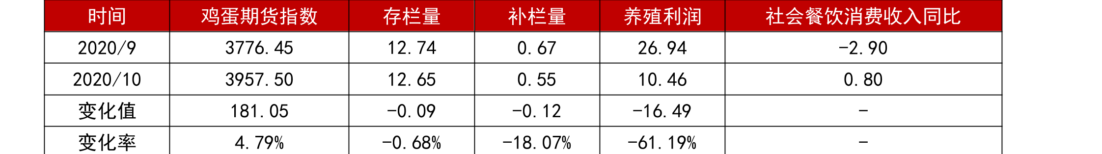 2020年 9月-2020年 10月鸡蛋期货指数变化及产业供需情况 单位:元/500kg;亿只;元/只;%