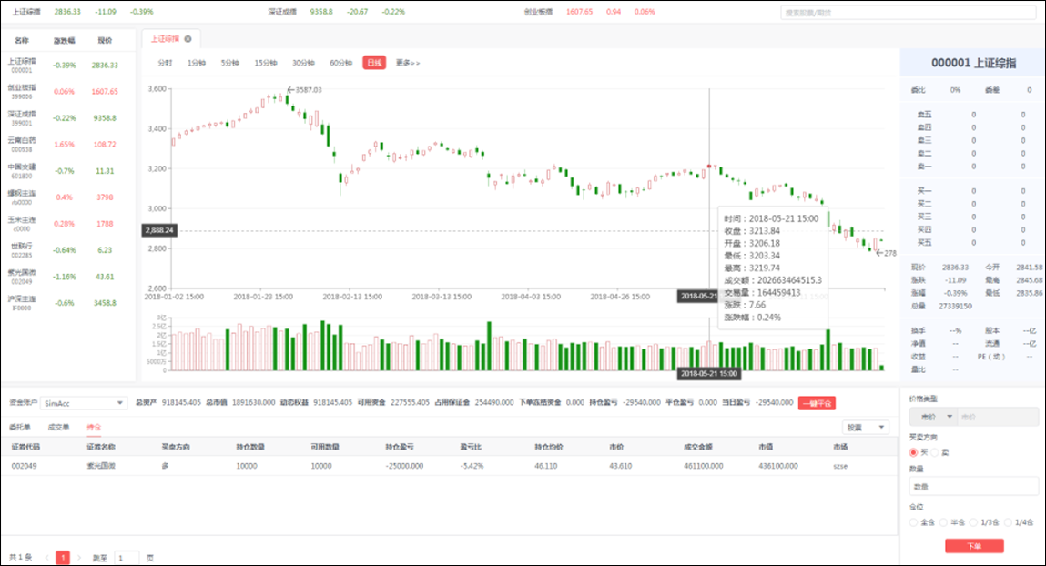 金融量化策略研究平台提供模拟交易所,支持全品种统一账户处理,更方便用户研究复杂策略,用户可通过模拟交易账户进行模拟交易。与实盘交易环境相仿,提供实时行情与模拟交易,后台会每天对每个交易账户进行资金清算。客户可在网站中对账户灵活地进行添加、删除、资金调整等管理操作。