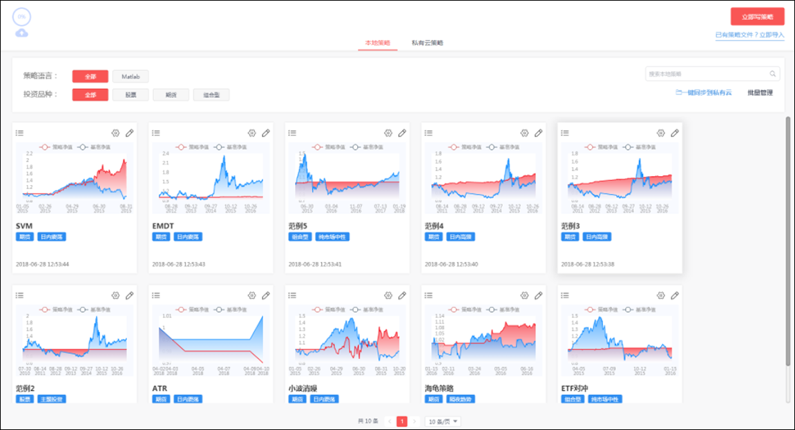 全国首推【策略资源池】,利用 金融量化策略研究平台开发的所有策略模型可通过此功能上传研究产出的策略成果, 并分类保存管理,并随时查看策略思路说明、策略源代码和业绩报告。根据存储位置,资源池分为云端资源池和本地资源池
