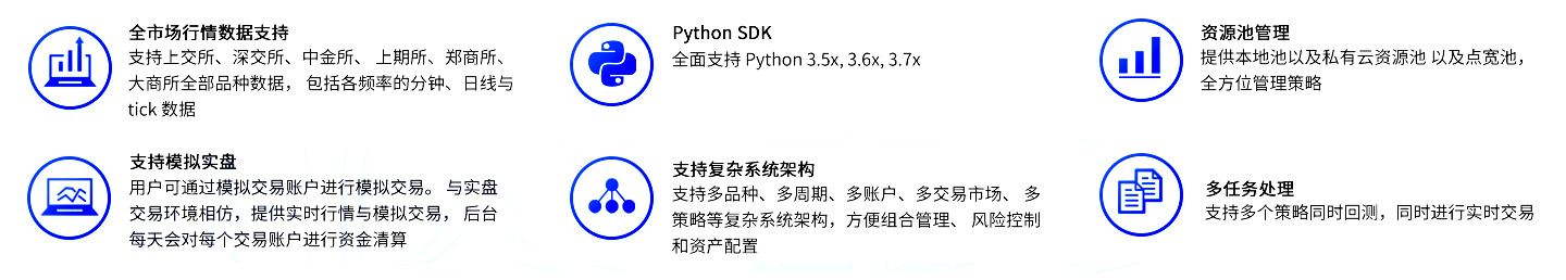 金融量化策略研究平台支持上海证券交易所、深圳证券交易所、中国金融期货交易所、上海期货交易所、郑州商品交易所、大连商品交易所的全部品种数据,包括各频率的分钟、日线数据与tick数据,以及各公司财务报表,市场舆情等基本面数据